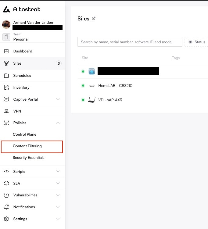 Go to Policies → Content Filtering in the Altostrat portal.