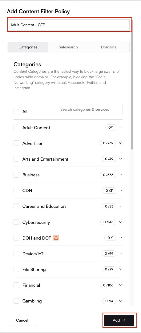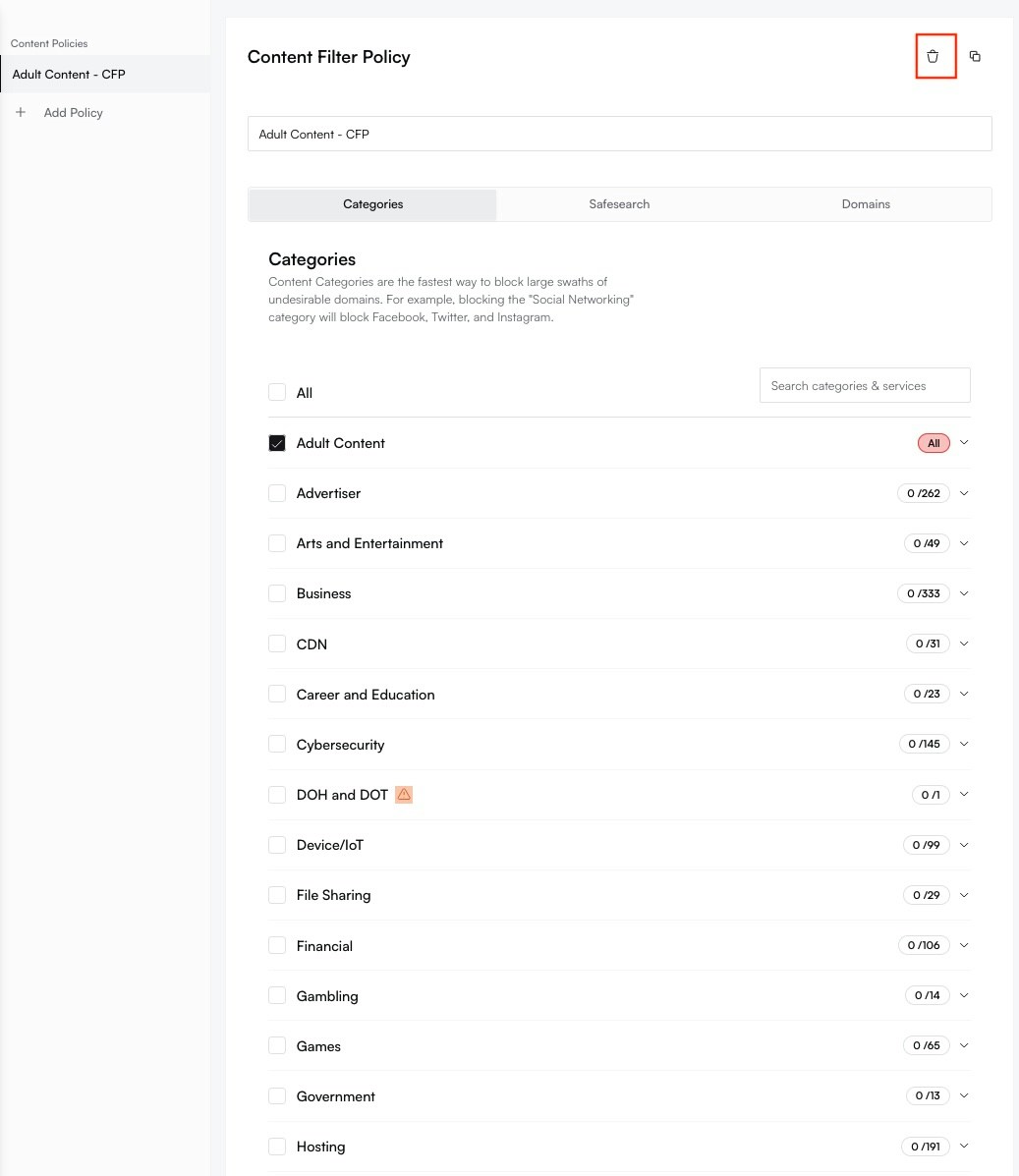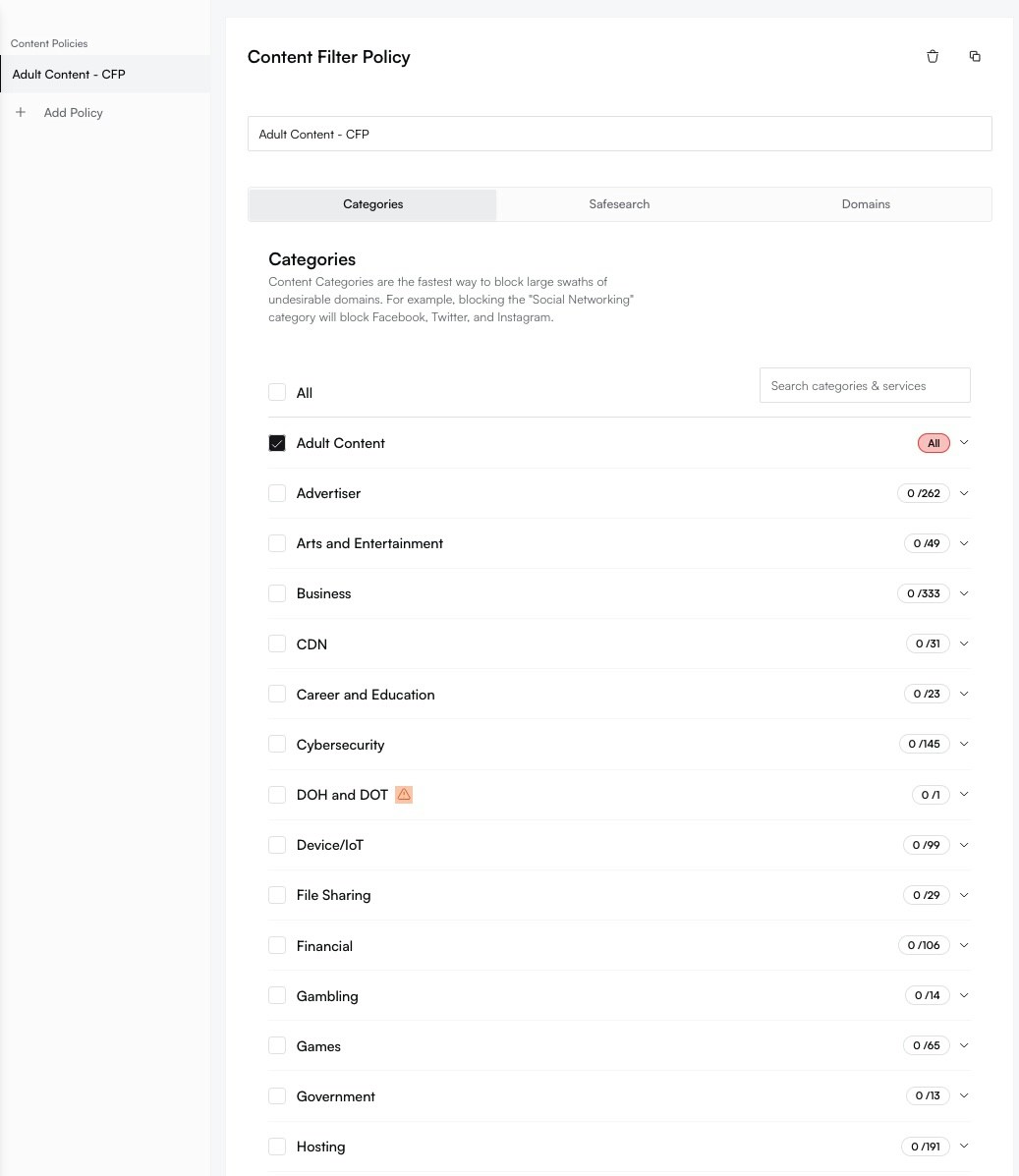 Modify the policy as needed: toggle categories, adjust SafeSearch settings, or manage custom domain lists.