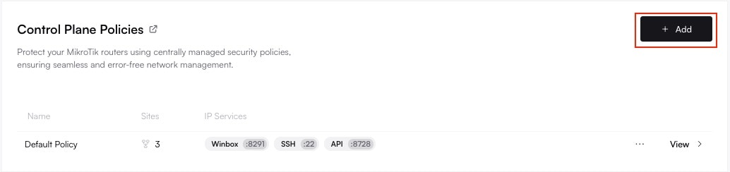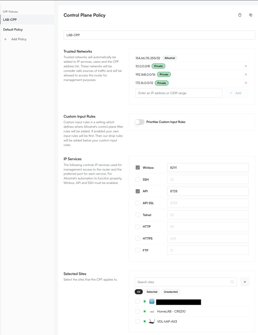 Altostrat’s Control Plane Policies define how MikroTik devices handle inbound connections for critical management services such as WinBox, SSH, and API. By centralizing firewall rules and trusted networks, you ensure consistent security across all routers under a given policy.