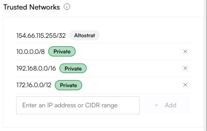 Add or remove IP addresses or CIDR ranges that you consider trusted. For example: 192.168.0.0/16.
