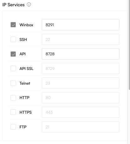 Under IP Services, specify ports for WinBox, SSH, and API. These services must remain enabled if you plan to manage devices via Altostrat’s API.