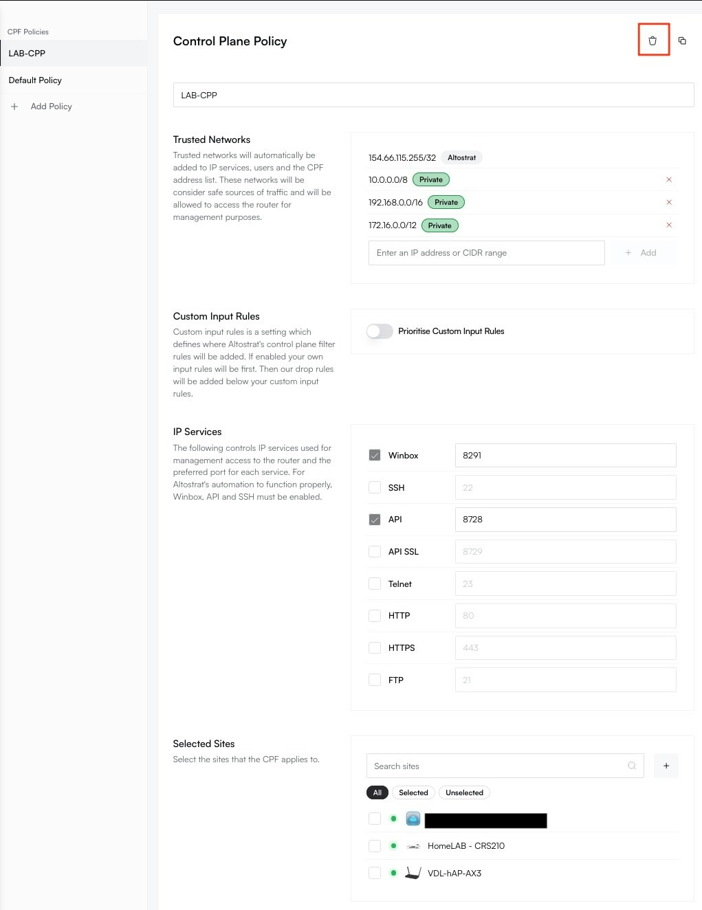 Click the Trash icon and confirm the action. If any routers depend on this policy for inbound admin services, assign them another policy first.