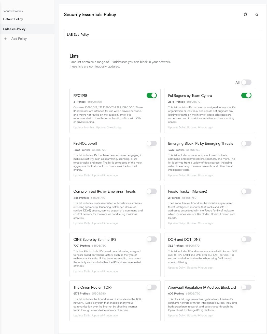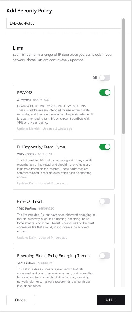 Choose the specific threat intelligence feeds (BGP/DNR Lists) you want to enable within this policy. The available feeds can be viewed (View available BGP/DNR lists via API). Select feeds based on desired protection level and potential operational impact.