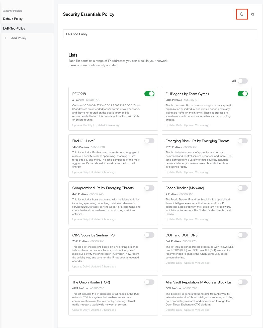 Click on the name of the policy you wish to modify. Toggle the desired threat feeds (BGP/DNR Lists) on or off as needed within the policy configuration.