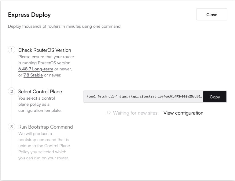 - This workflow securely generates the necessary commands to link your physical MikroTik hardware to this logical site representation in Altostrat SDX.