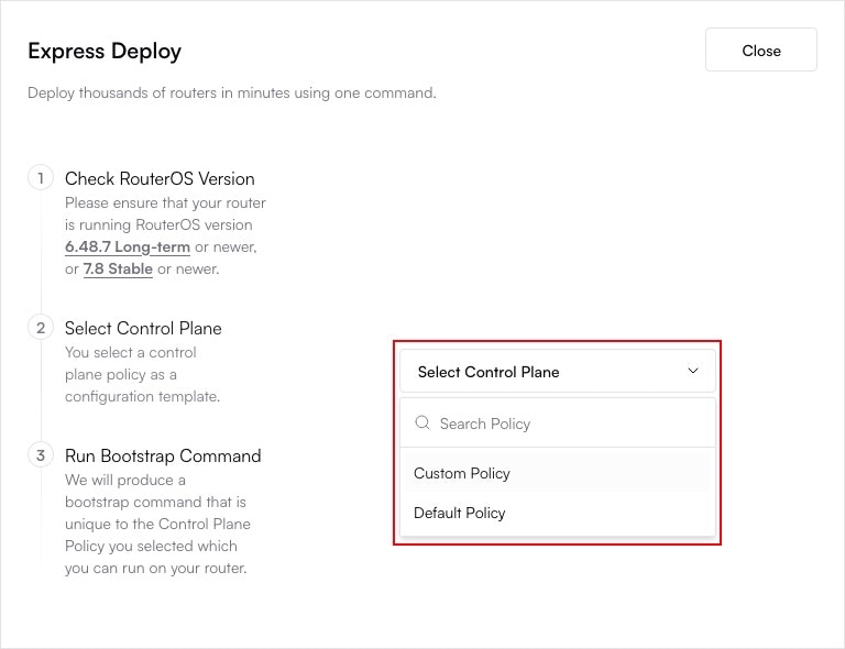- You may be prompted to select an initial Control Plane Policy for the device (or the default policy might be automatically selected). This policy governs basic management access and firewall settings. (Learn More).