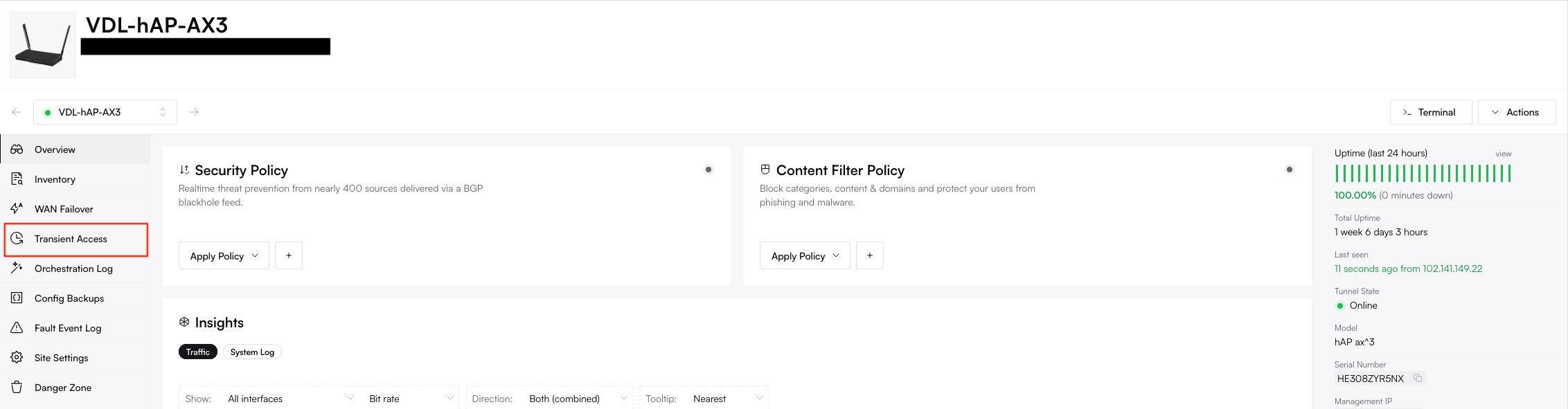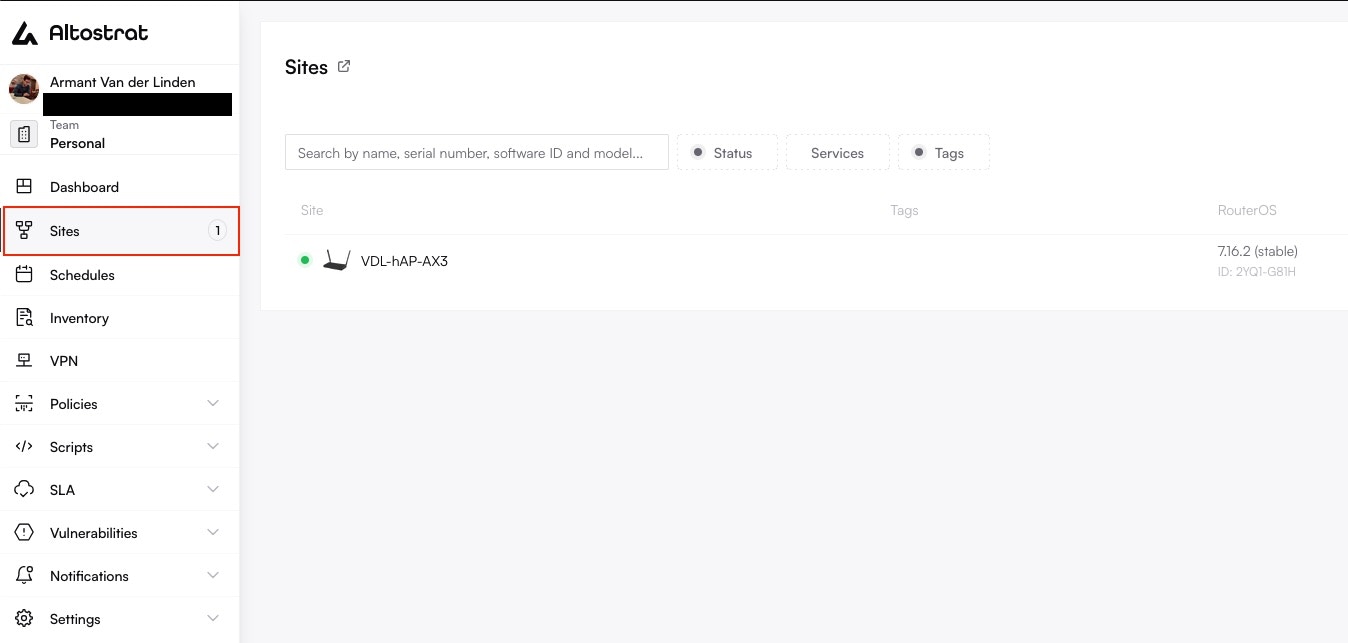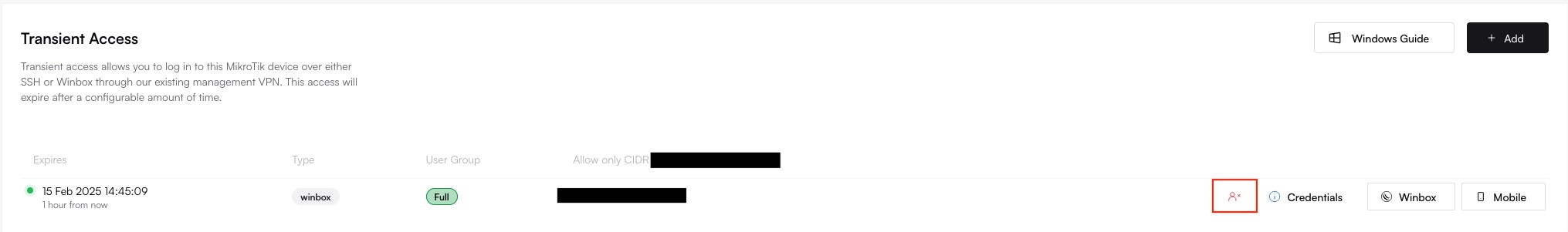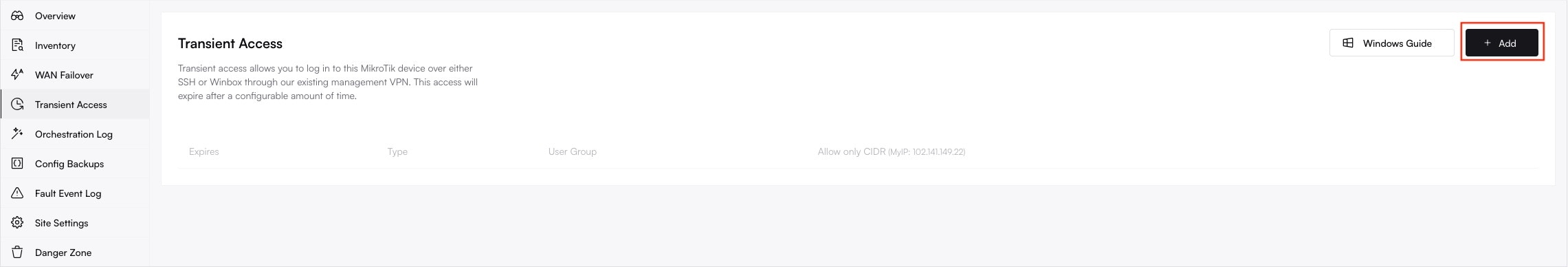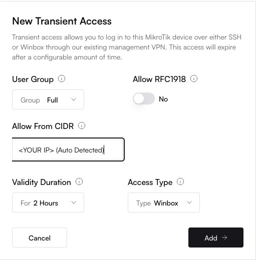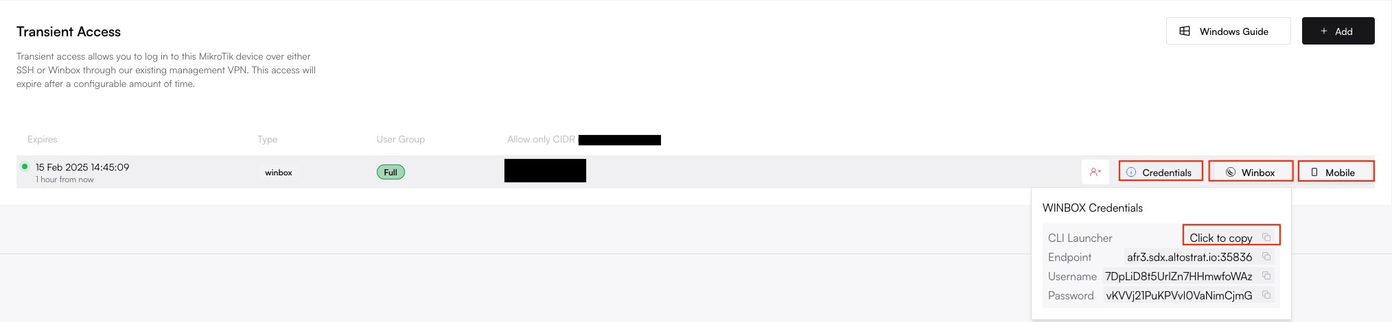 When you add a MikroTik router to Altostrat, we automatically configure a secure tunnel called the Management VPN. This VPN enables enables you to create temporary access to the router—called Transient Access—by generating short-lived credentials for WinBox or SSH. Once they expire, these credentials are automatically revoked, keeping your device secure.Requirements