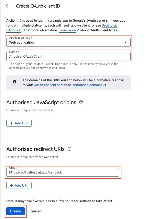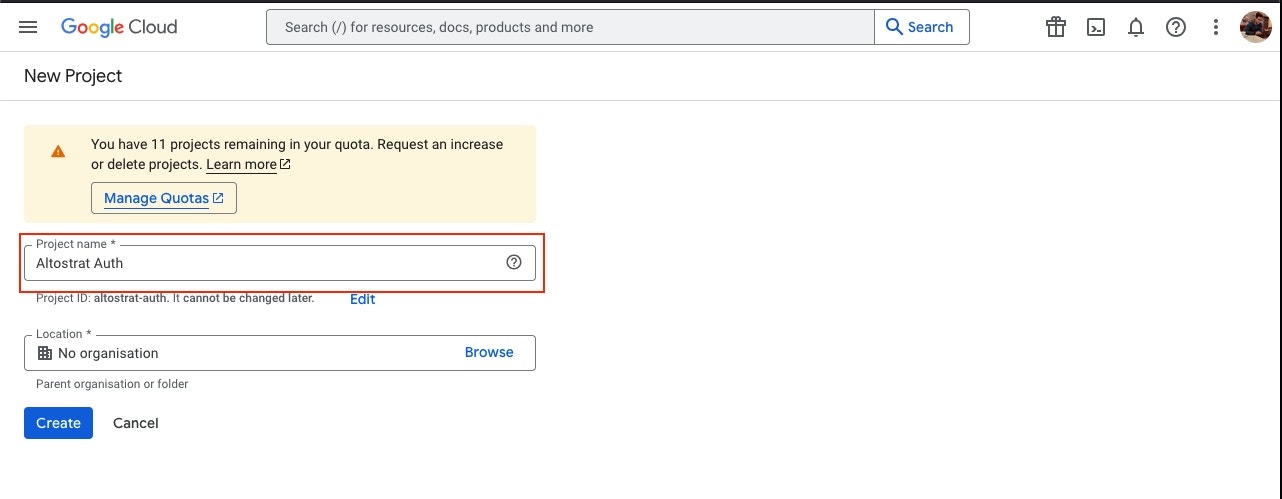- Name the project (e.g., “Altostrat Auth”) and confirm creation.