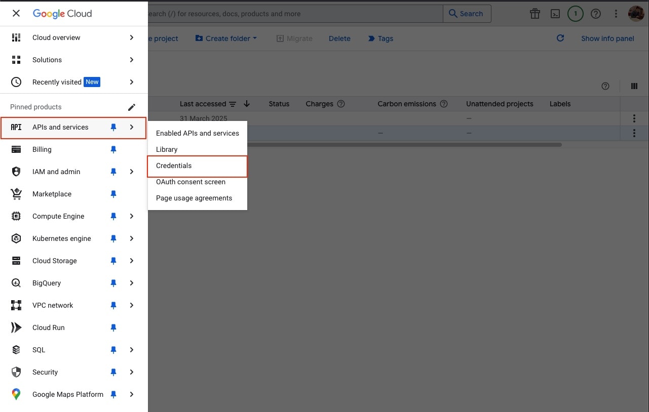 - In the left-hand menu, choose APIs & Services → Credentials.