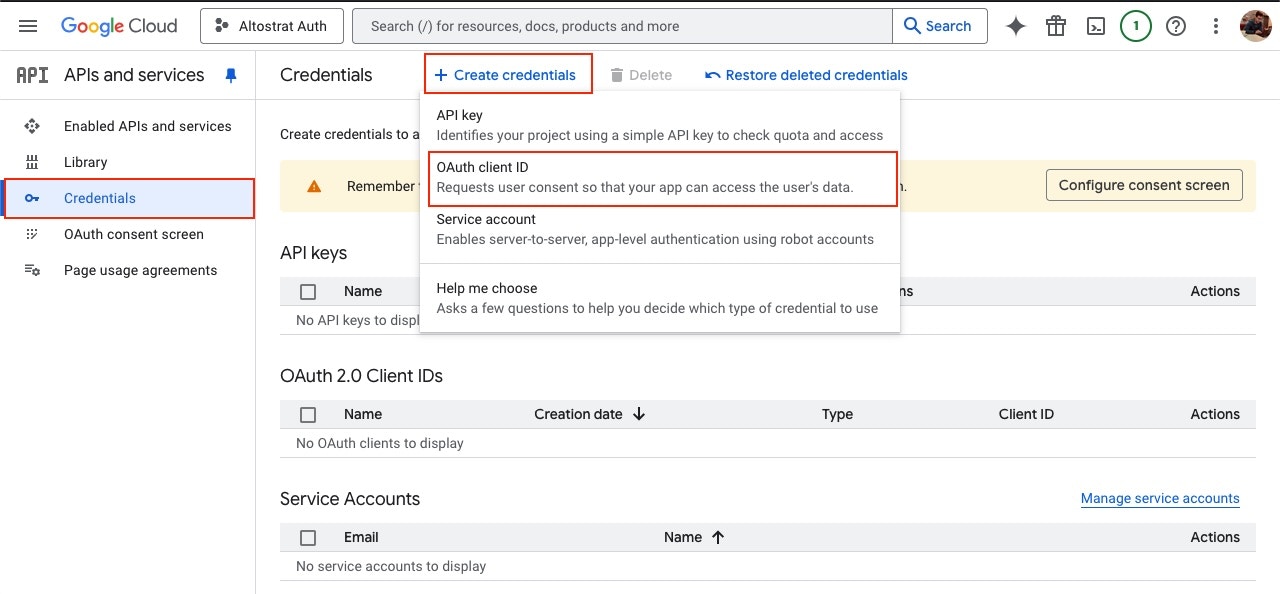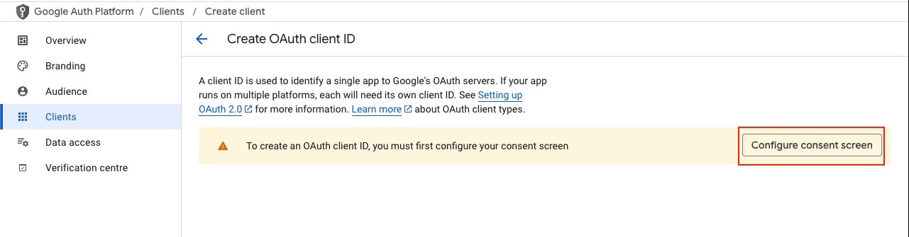 If not set up, Google prompts you to configure an OAuth Consent Screen.