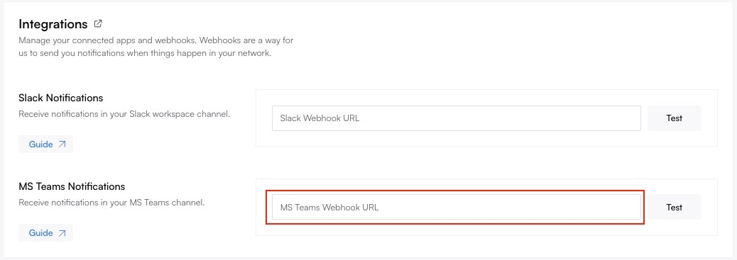 Find the Teams integration and enter the webhook URL you copied from Microsoft Teams.