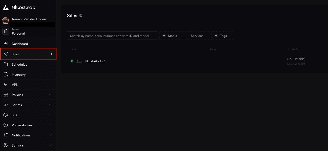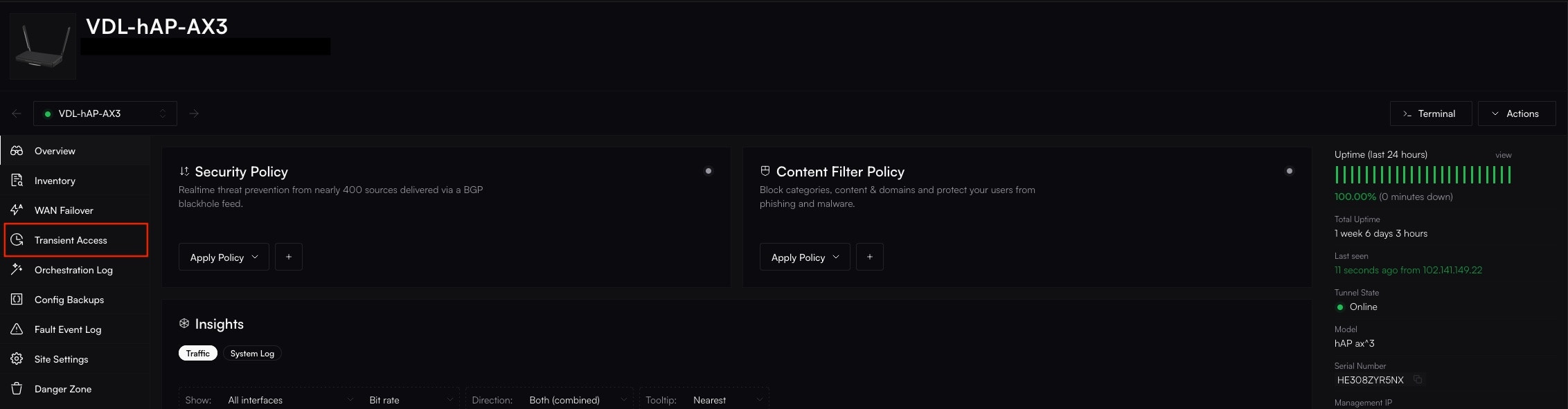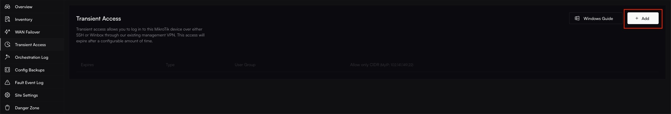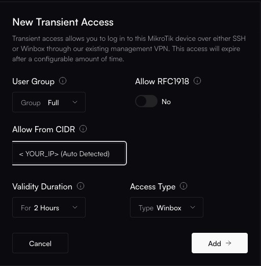 When you add a MikroTik router to Altostrat, we automatically configure a secure tunnel called the Management VPN. This VPN enables enables you to create temporary access to the router—called Transient Access—by generating short-lived credentials for WinBox or SSH. Once they expire, these credentials are automatically revoked, keeping your device secure.Requirements