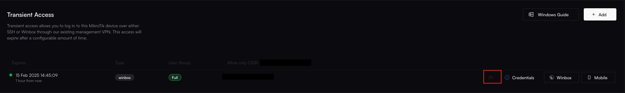 If you need to remove credentials before they expire:- Return to the site’s Transient Access tab in the Altostrat portal.