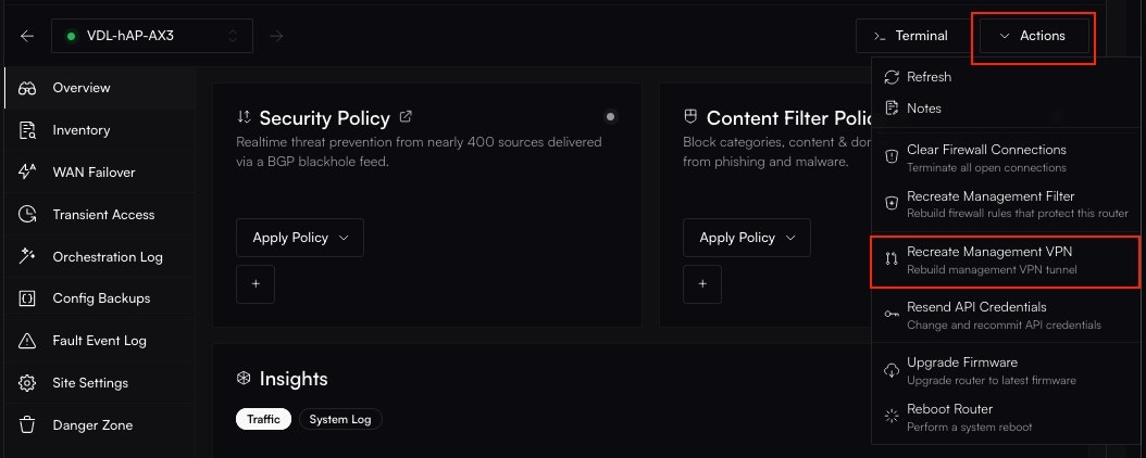 Look for a Recreate or Restore Management VPN button. Clicking it triggers a job to wipe the old config and re-establish the tunnel.