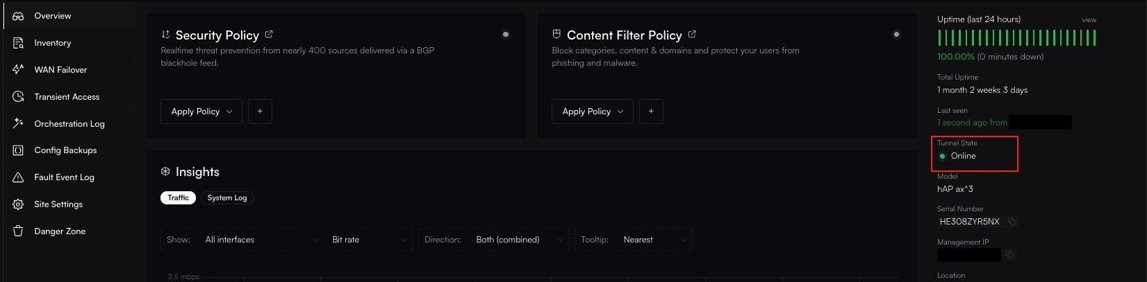 Wait a few seconds, then check if the router shows as Online. The tunnel should reappear under Interfaces in Winbox, typically labeled with the site’s UUID.